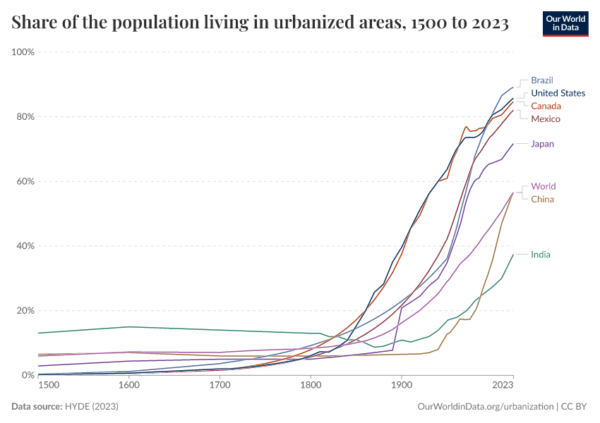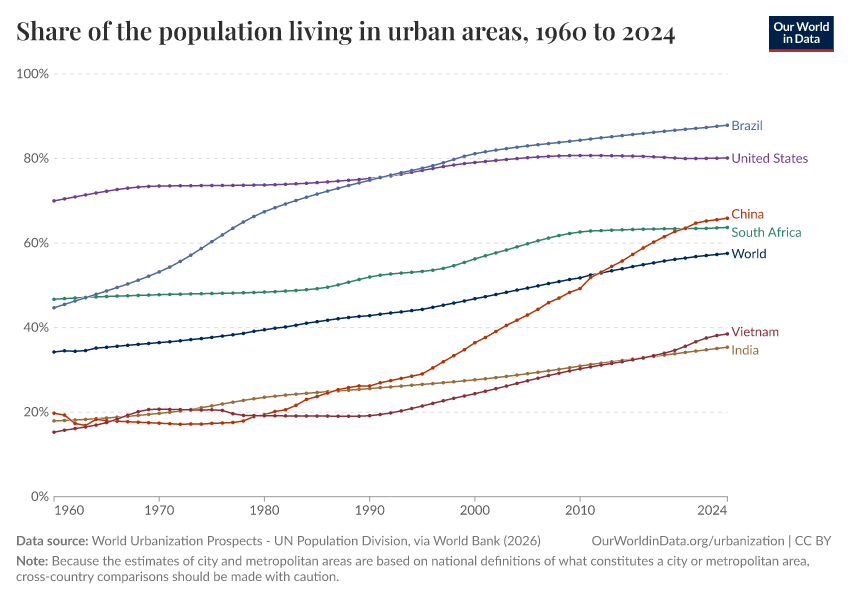 Hannah Ritchie, Veronika Samborska, and Max Roser (2024) - “Urbanization” Published online at OurWorldinData.org. Retrieved from: 'https://index-dataset-dim.owid.pages.dev/urbanization' [Online Resource]BibTeX citation