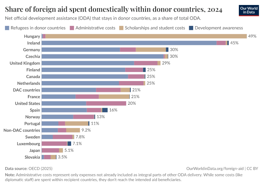 Another element that may be surprising is student scholarships — these can count as aid when they align with the host country's development plans.12 For most countries, this contribution is very small. But there are a few exceptions. Hungary is the most extreme case: it uses 41% of its aid budget for foreign students. In addition to refugee support and scholarships, aid money spent domestically includes funding for development awareness programs and administrative costs not already incorporated into specific aid initiatives.