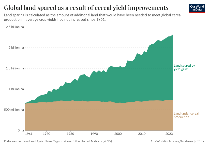 If global average cereal yields were to have remained at their 1961 levels, we can see (in red) the amount of additional land we would have had to convert to arable land to achieve the same levels of cereal production. This 'spared' land is large – close to the area of the United States and India combined.