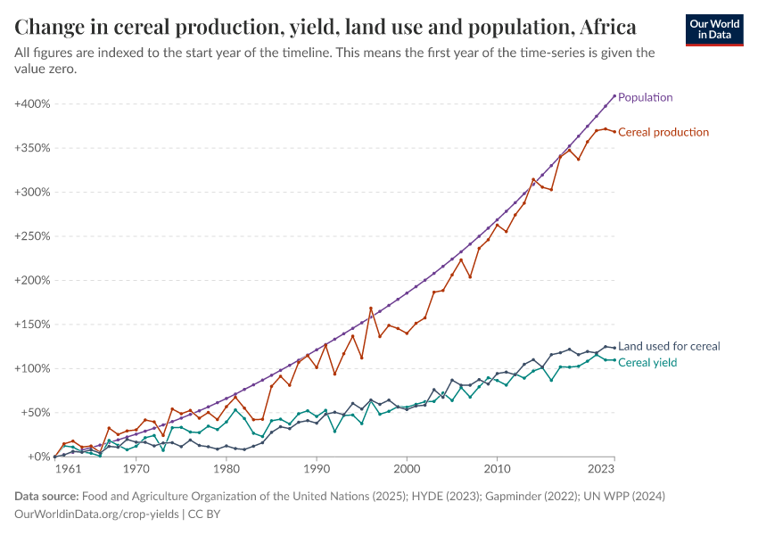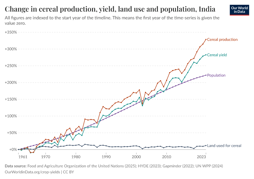 In the chart below we have mapped four variables: total cereal production; average cereal yield; land area used for cereal production; and total population. These are measured as an index relative to their respective values in 1961 (i.e. 1961 is equal to 0).