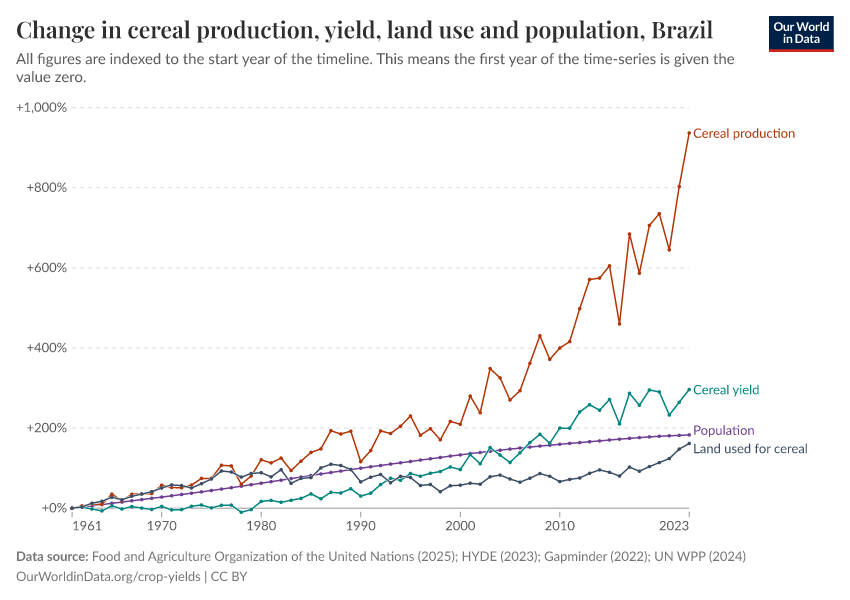 Brazil’s cereal production has increased dramatically since 1961, far exceeding its population increase.