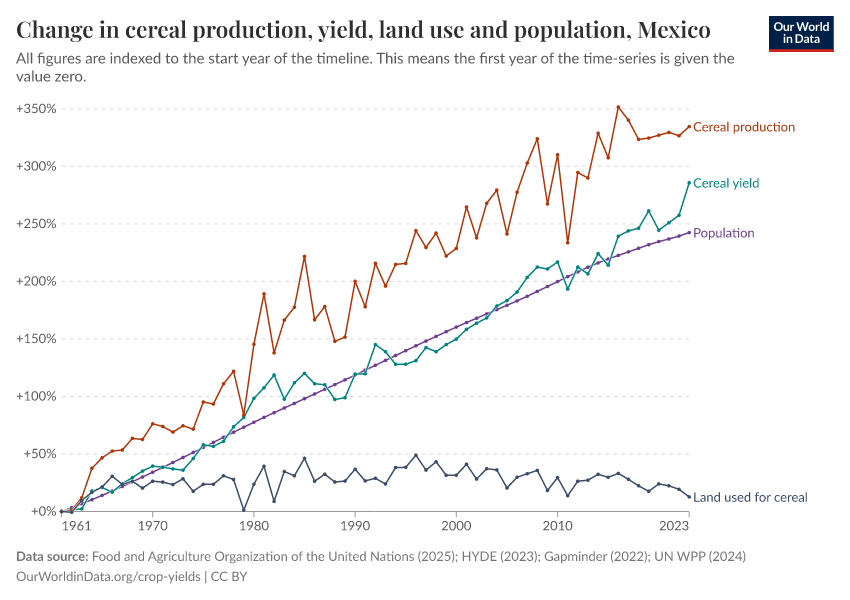 In the chart below we see cereal production, land use and yield trends for Mexico over the period from 1961. Mexico was one of the first countries to be linked to the Green Revolution of the 20th century.1